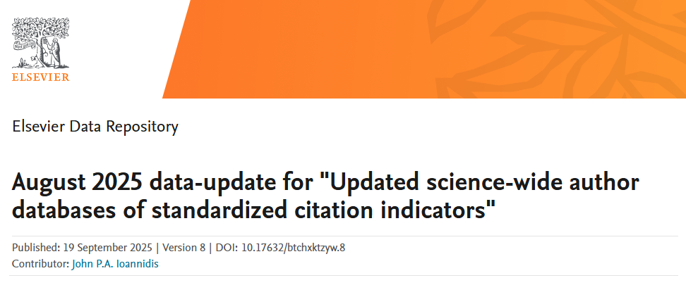 近日,斯坦福大学(Stanford University)和国际权威学术出版社爱思唯尔(Elsevier)共同发布了2025年全球前2%顶尖科学家榜单(World's Top 2% Scientists)。